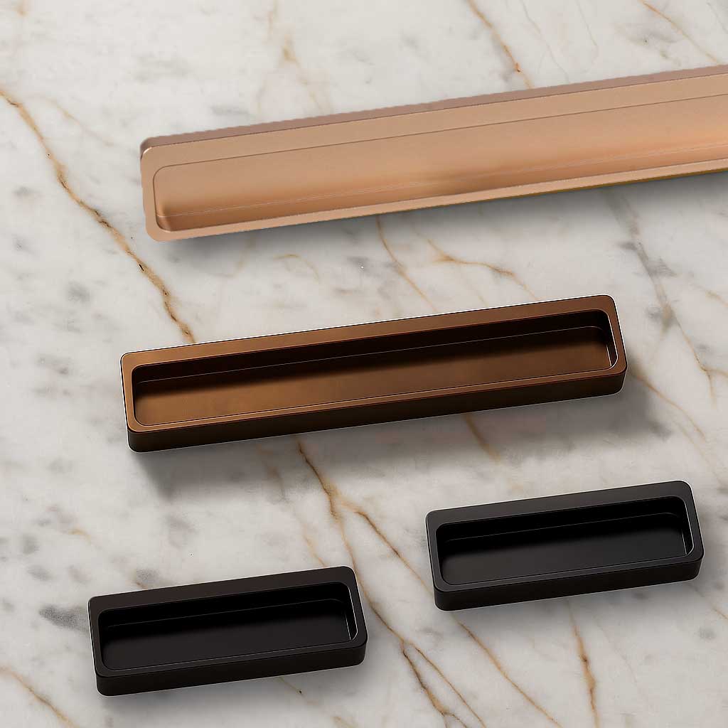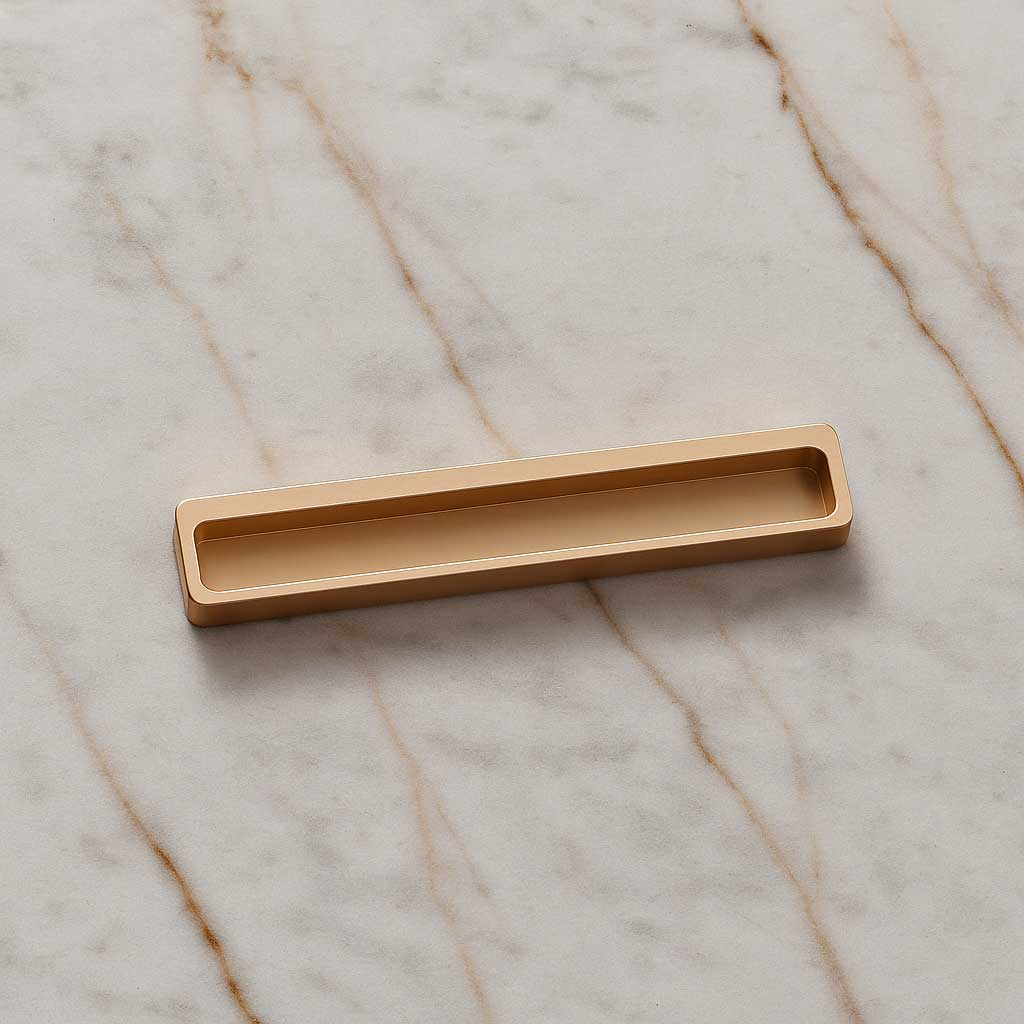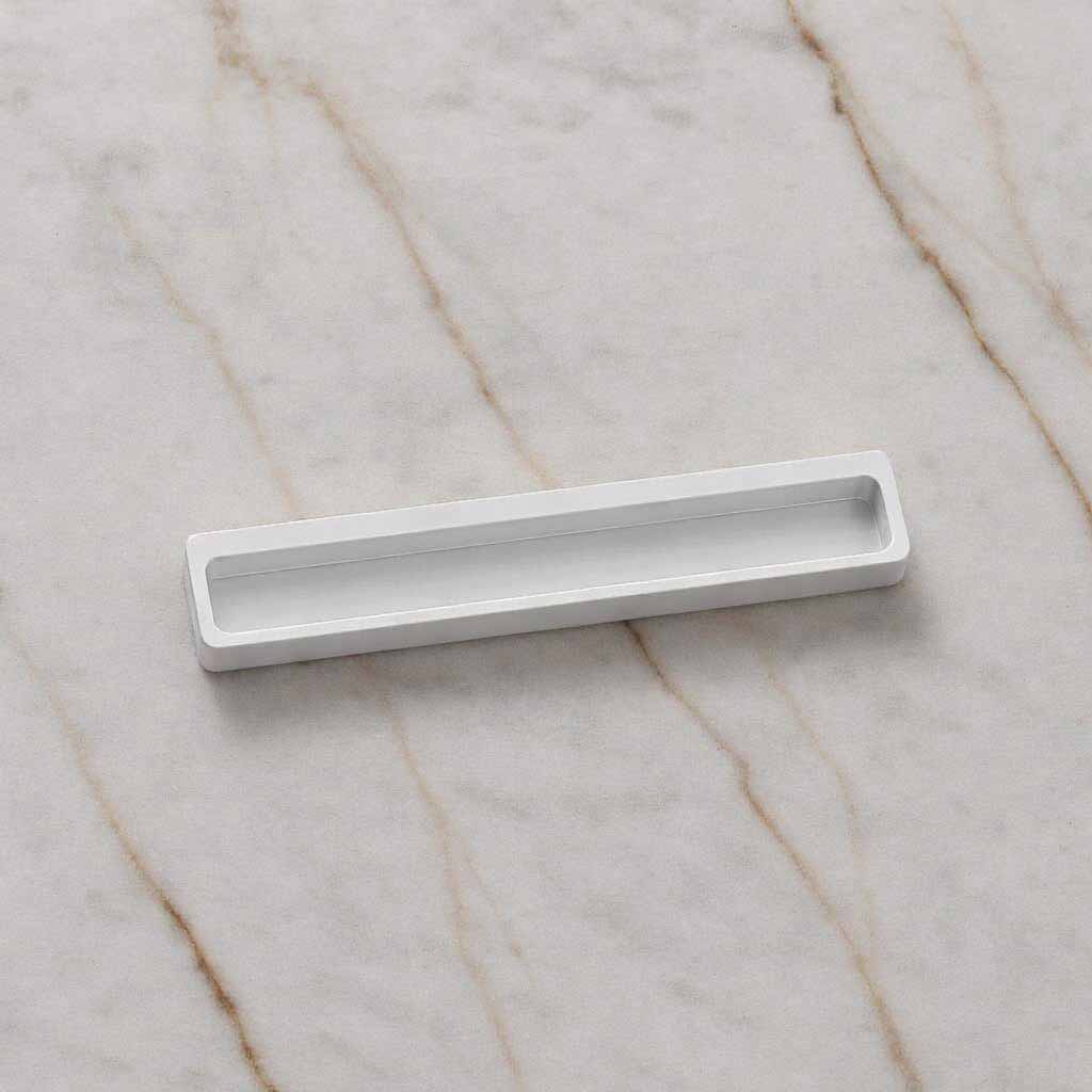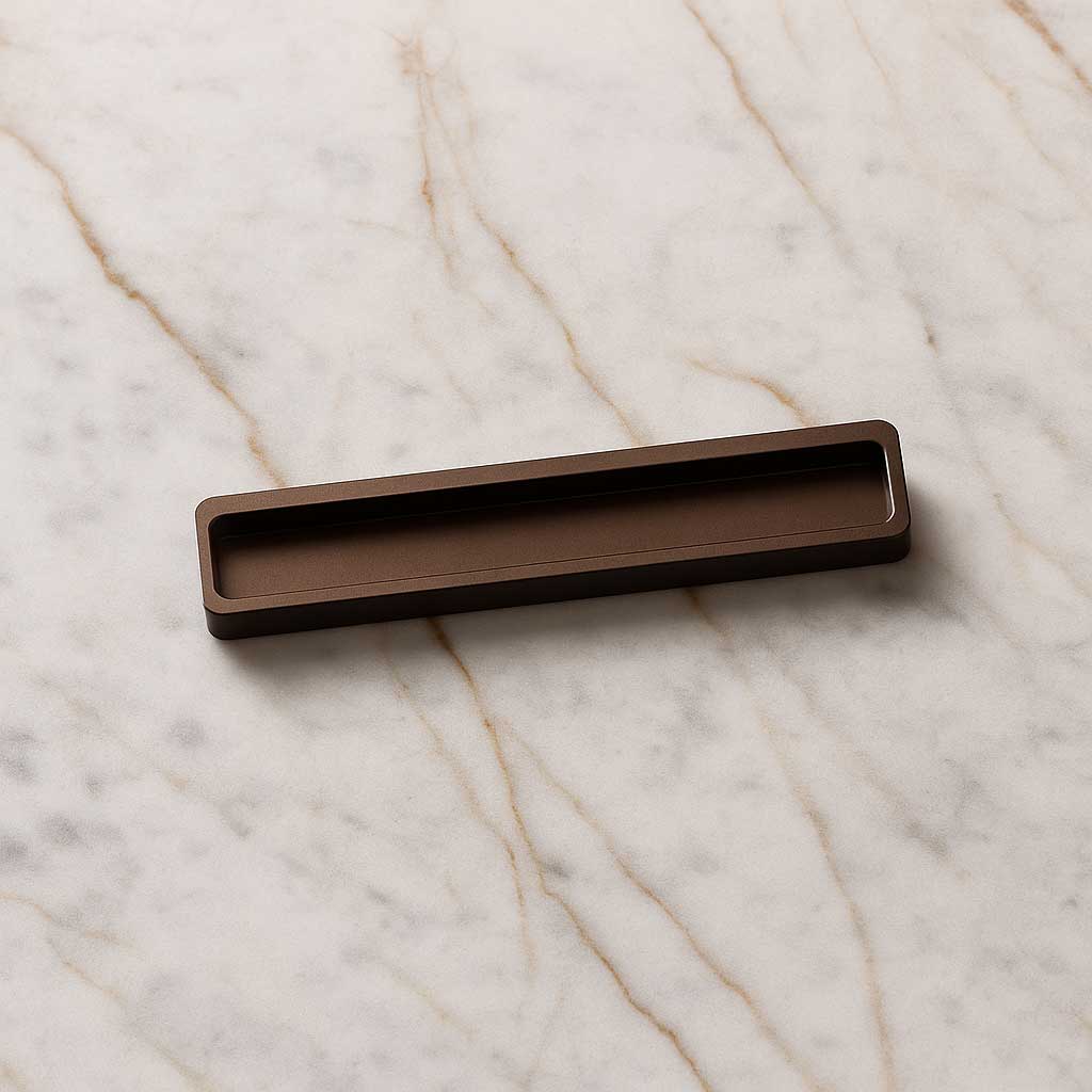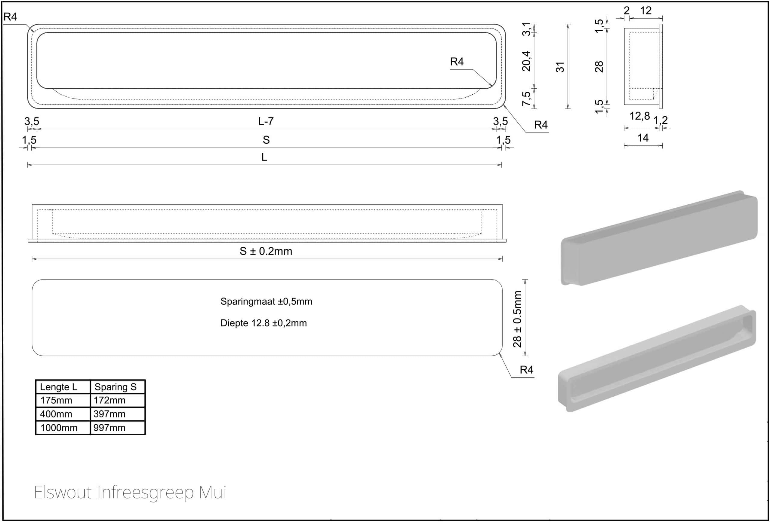 Geïnspireerd door de zachte lijnen van de kust en de natuurlijke diepte van een mui in het zand, vormt deze greep een subtiele maar krachtige toevoeging aan elk maatwerkinterieur. De langgerekte verzonken vorm voelt vanzelfsprekend aan en accentueert het horizontale lijnenspel van moderne kasten en deuren. De Mui is verkrijgbaar in drie lengtes: 175 mm, 400 mm en 1000 mm, met een breedte van 31 mm. Bij montage wordt het midden van de greep standaard ingefreesd op 105 cm vanaf de vloer, wat neerkomt op 103,5 cm op de deur, met een hartafstand van 3 cm vanaf de rand voor een perfect uitgebalanceerde uitstraling. Met haar ingetogen vormgeving en natuurlijke uitstraling is de Elswout Mui de ideale keuze voor wie zoekt naar een subtiele finishing touch die vakmanschap en rust uitstraalt.