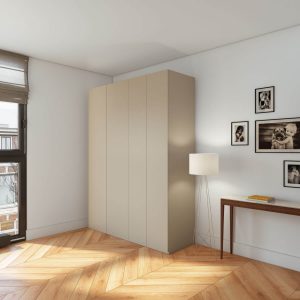 Onze deuren en scharnierboringen zijn ontworpen voor het IKEA Pax kastsysteem en sluiten perfect aan op zowel de ondiepe (35 cm) als diepe (58 cm) kasten. U kunt kiezen voor een deur die gelijk is aan de hoogte van de kast, of voor een verlengde variant die doorloopt tot 1,5 cm onder het plafond. Dit kan tot een maximale hoogte van 238 of 274 cm, afhankelijk van uw kastsysteem. De onderzijde kan eindigen op 1,5 cm of 7 cm van de vloer, wat zorgt voor een fraai zwevend effect.