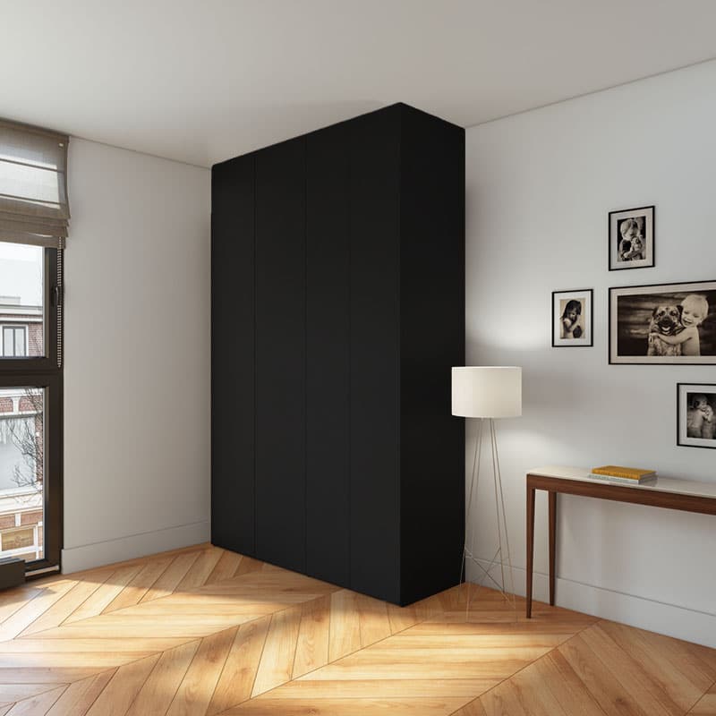 Geef jouw kledingkast een hoogwaardige uitstraling met onze maatwerk kastdeuren op maat Extra mat Zwart voor Ikea Pax (U999PM). Deze deuren worden in Nederland geproduceerd en zijn perfect afgestemd op Pax elementen van 201 of 236 cm hoog. Kies uit verschillende uitvoeringen zoals linker- of rechterdeur, hoekdeur, zijpaneel of los paneel. Allemaal nauwkeurig op maat gemaakt.