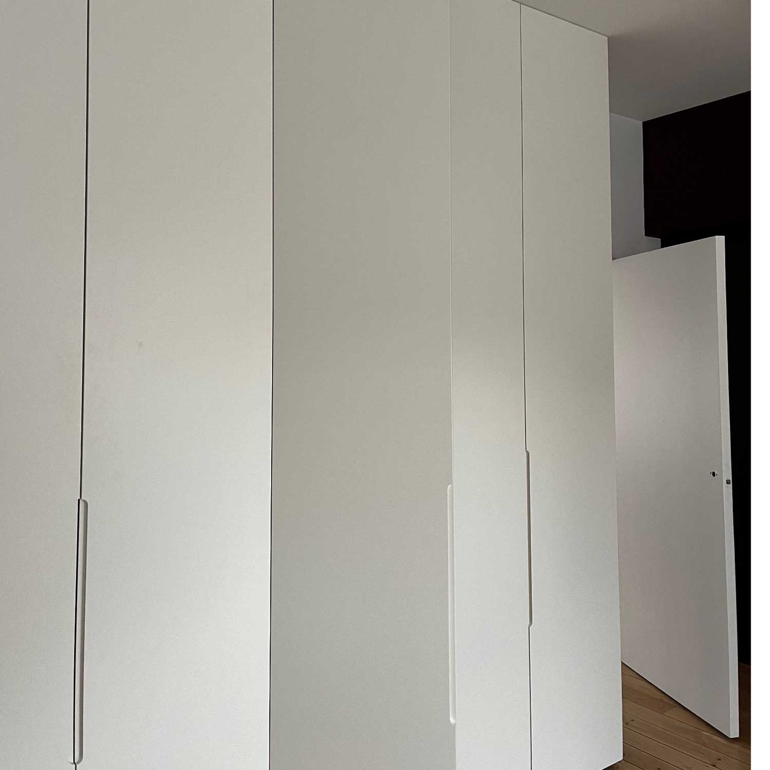 Onze deuren en scharnierboringen zijn ontworpen voor het IKEA Pax kastsysteem en sluiten perfect aan op zowel de ondiepe (35 cm) als diepe (58 cm) kasten. U kunt kiezen voor een deur die gelijk is aan de hoogte van de kast, of voor een verlengde variant die doorloopt tot 1,5 cm onder het plafond. Dit kan tot een maximale hoogte van 238 of 274 cm, afhankelijk van uw kastsysteem. De onderzijde kan eindigen op 1,5 cm of 7 cm van de vloer, wat zorgt voor een fraai zwevend effect.