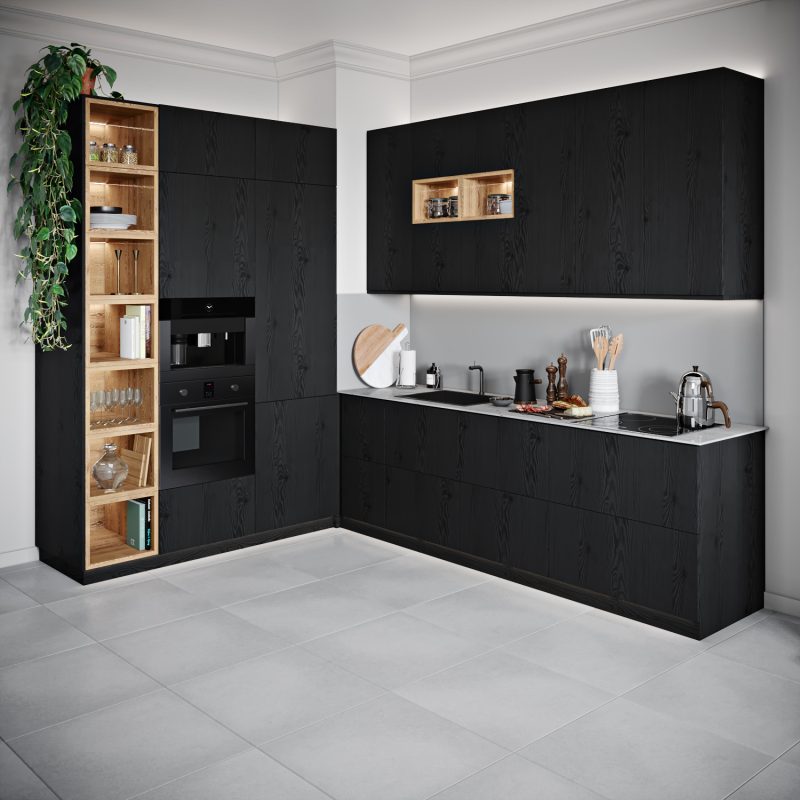 Voor METOD boren wij geen greepgaten voor, omdat de ideale positie per keuken verschilt en afhangt van je indeling. Combineer onze fronten met ons assortiment luxe grepen en knoppen. De bijpassende zwarte boutjes leveren we standaard mee.